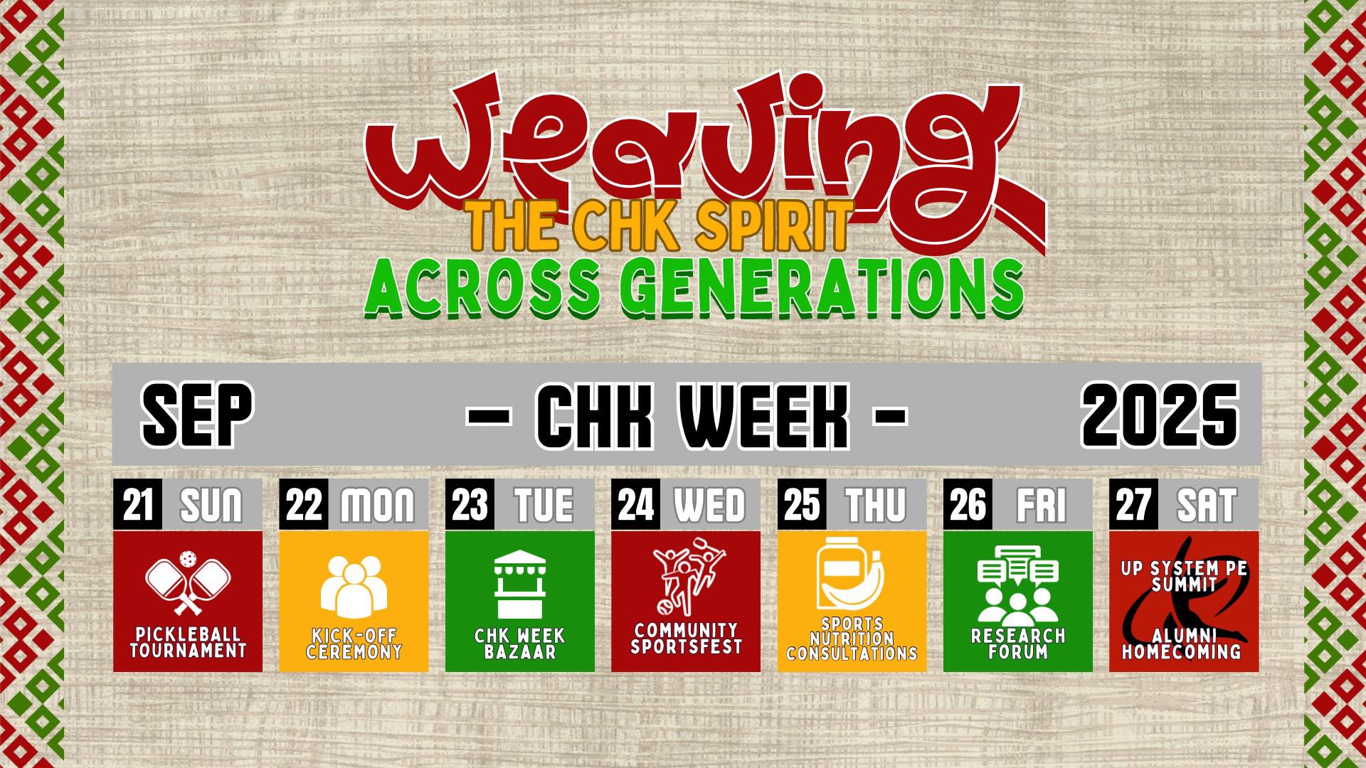 Here we go, CHK Week 2025! This September 21–27, we’re weaving the CHK spirit across generations with a week full of sports, culture, camaraderie, and connection. From the court to the community, we move, connect, and celebrate as one! A total of 48 teams are up for grabs under UP Students and UP Employees/Alumni categories (8 teams per event – Womens, Mens, Mixed).